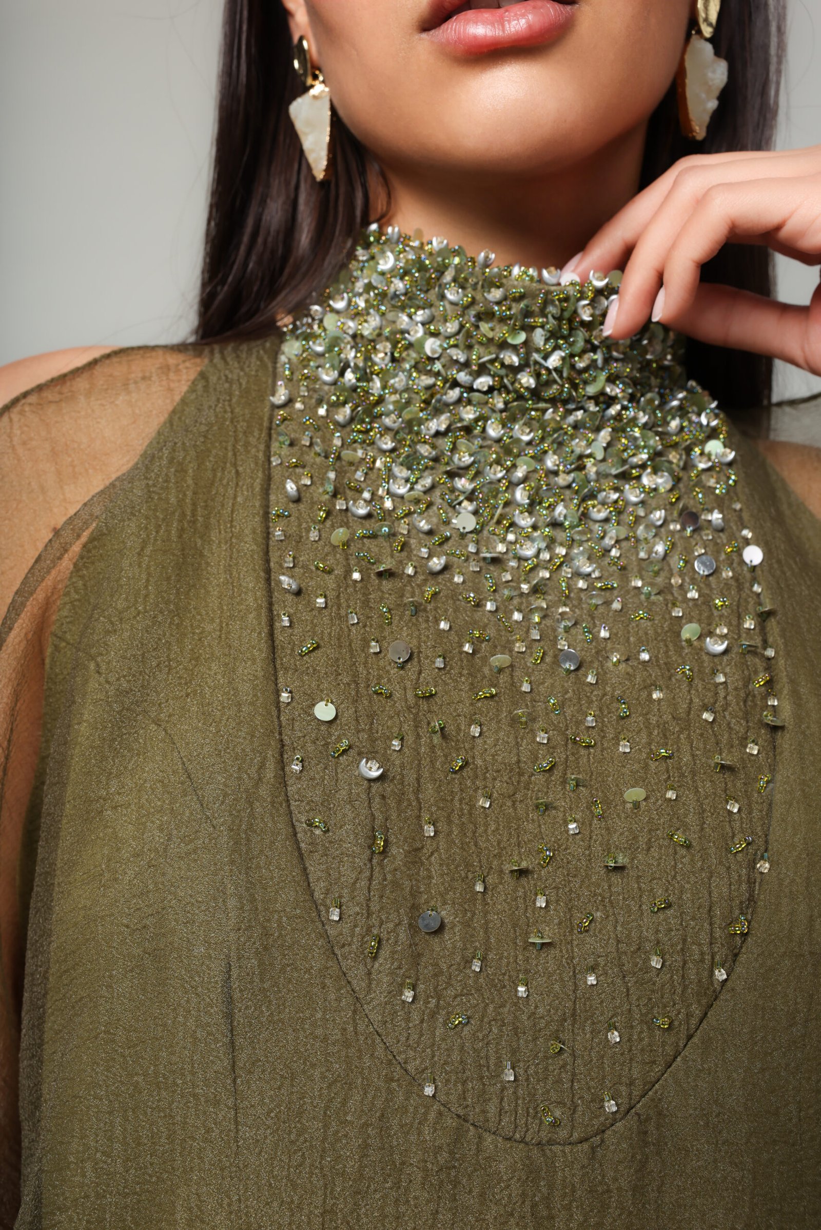 Craftmanship: Embellishments through high neck and front.