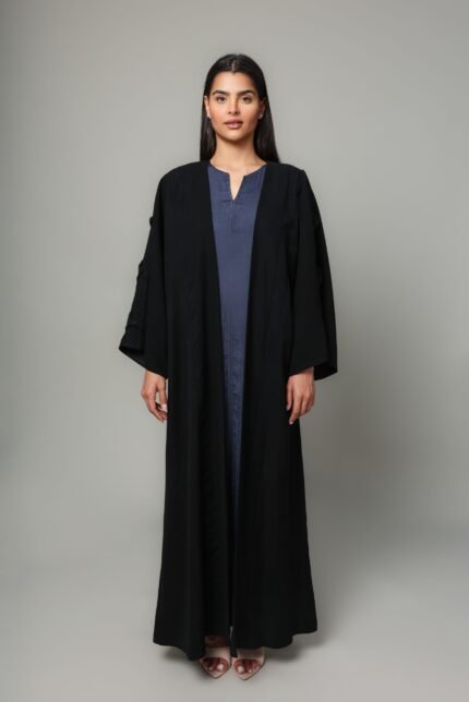 Make a statement in this chic kaftan dress. The farasha style cape dress is a combination of soft crepe with sheer bubble organza showcases a stylish high neck artistically covered with embellishments adding a luxurious look. The detachable cape adds a romantic flair, making this a perfect piece for any special occasion.