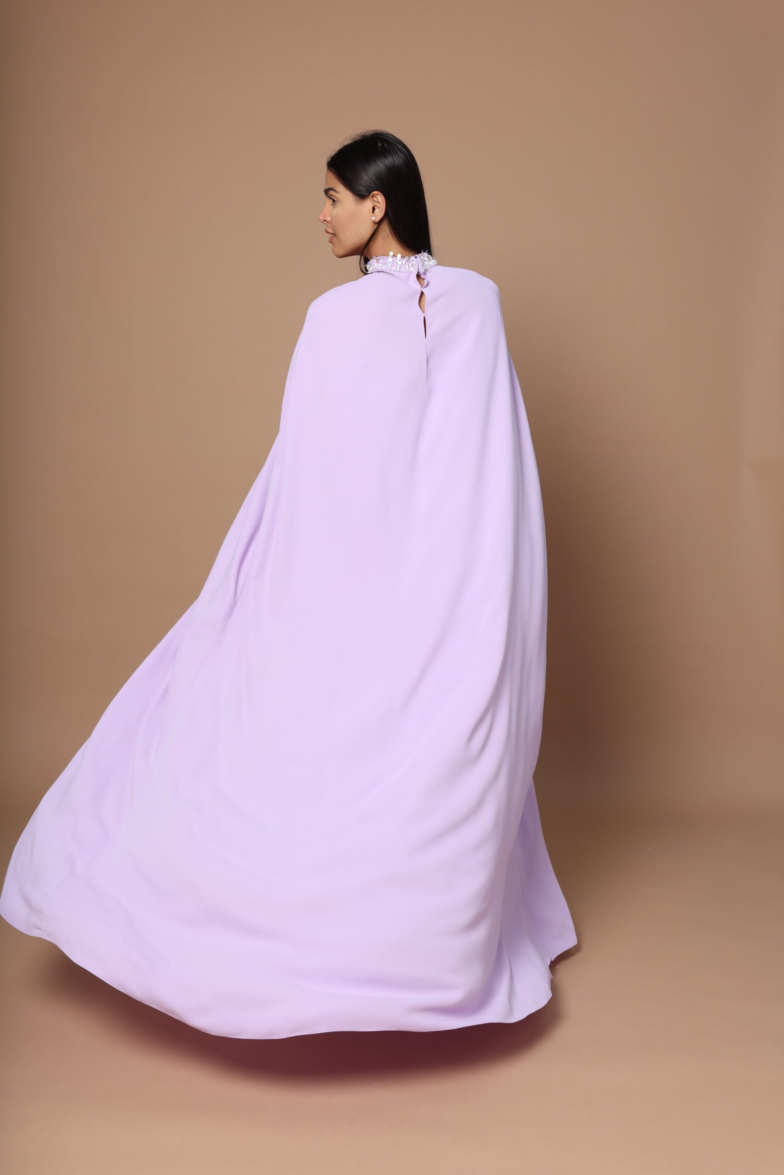 This elegant ethnic cape style Kaftan dress features a fitted inner with a decorated cape and sophisticated high neck, beautifully adorned with intricate embellishments that extend down the neck, chest panels, and waist. The soft crepe material enables the cape flow gracefully over the shoulders, creating a striking silhouette that is both regal and modern.