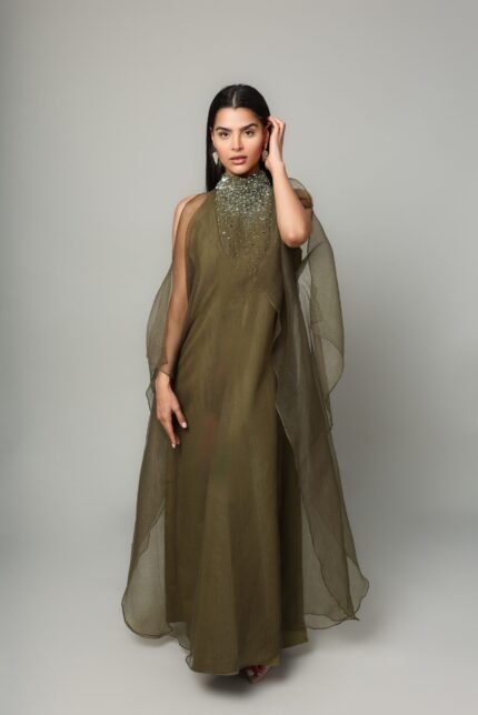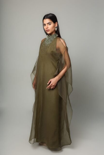 Step out in style with this chic asymmetrical off-shoulder dress. The dress is made from soft crepe with artwork on neckline that features handcrafted flowers decorated with white pearls that trail beautifully across the shoulders. the long draping cut sleeves enhance the look, making it perfect for any special occasion.