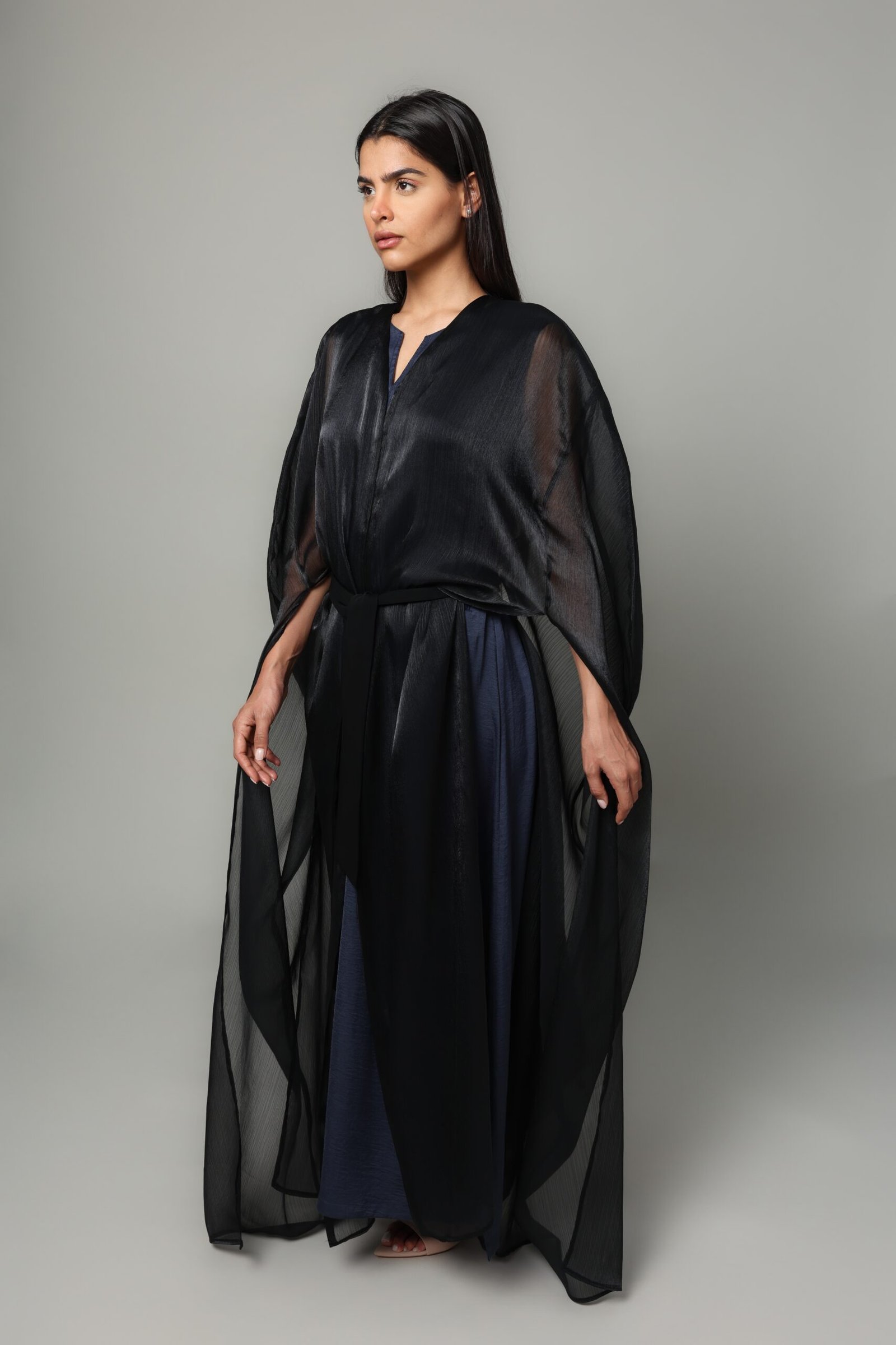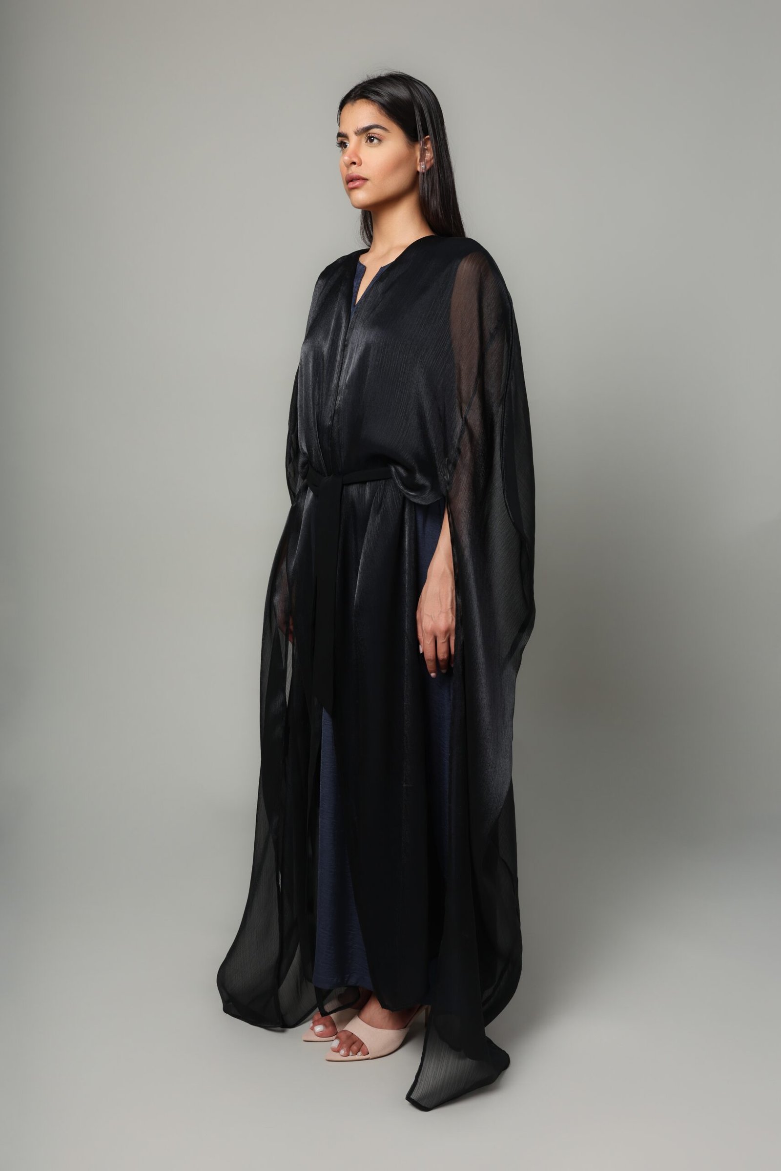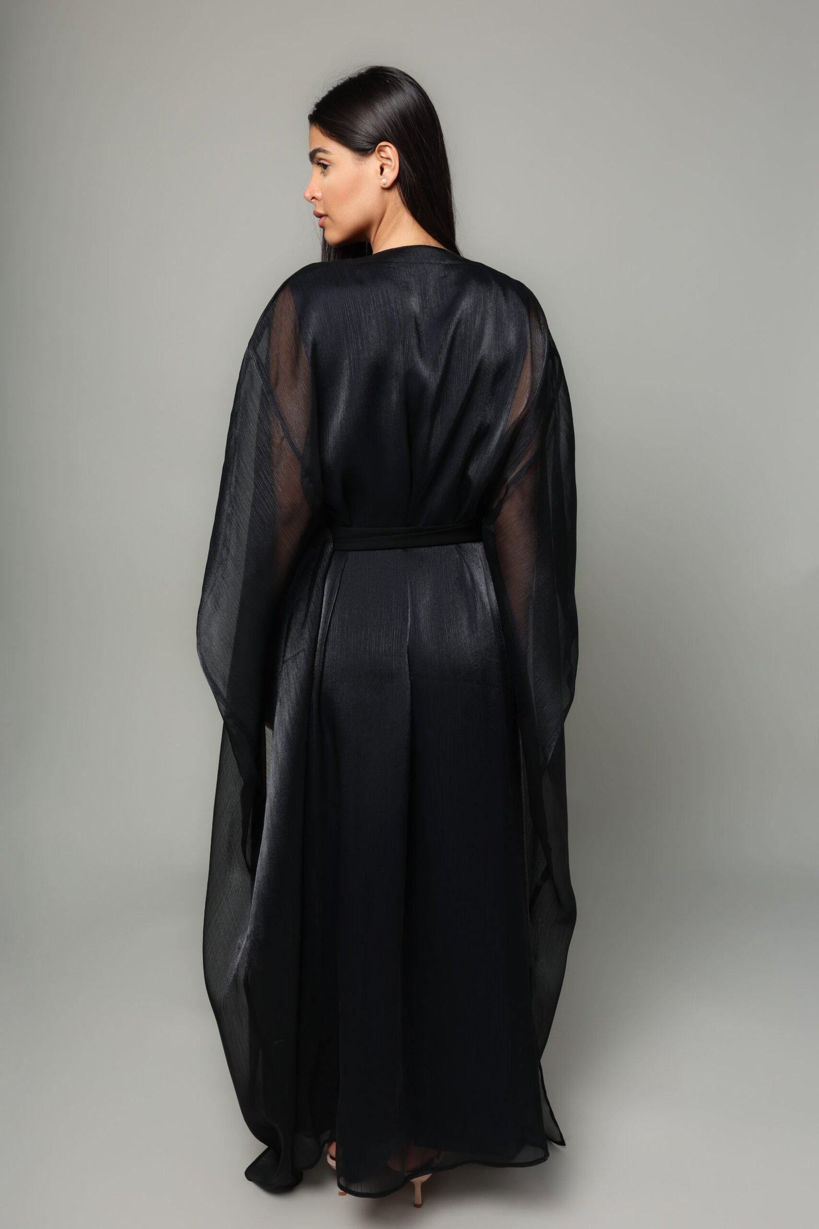 This luxurious party abaya is a masterpiece of modern ethnic wear. Crafted from a delicate, crinkle sheer organza, it features sophisticated cape-style cuts that flow gracefully, creating an ethereal silhouette. The design is cinched at the waist with a sleek belt, adding structure and a touch of contemporary elegance.